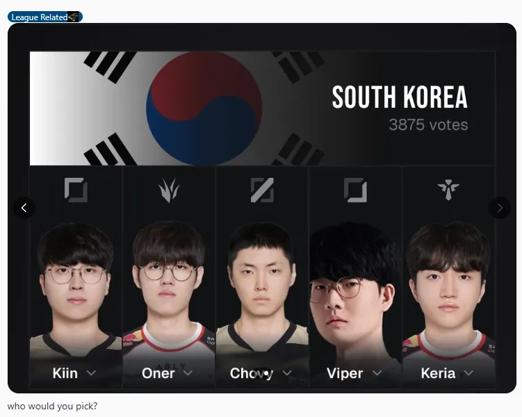 “英雄联盟韩国代表队有两套阵容:推特转发流量队以及Oner狂抢Chovy和Viper五杀队,你会选哪个?”